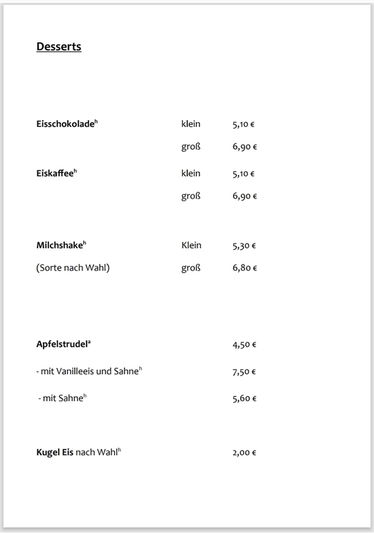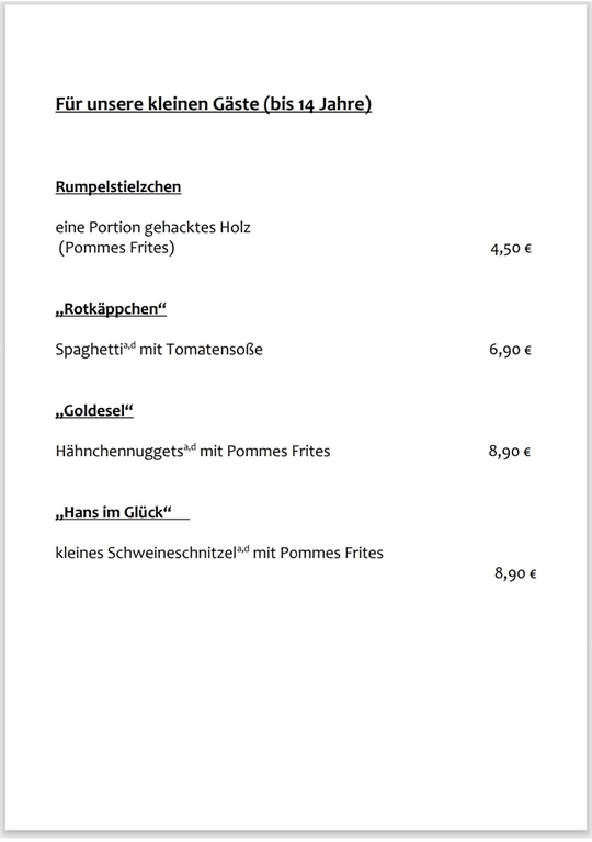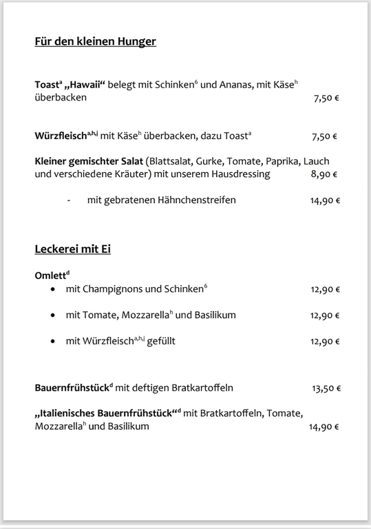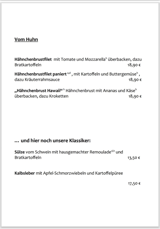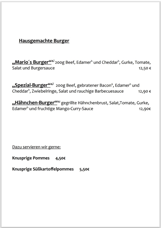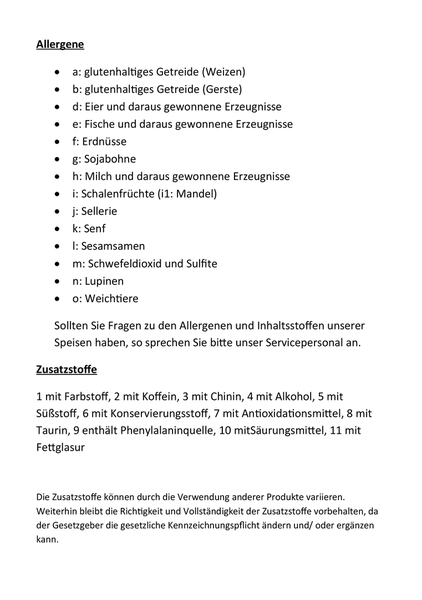 Die Zusatzstoffe in unseren Speisen und Getränken entnehmen Sie bitte dem Informationsblatt, zu erfragen beim Personal.